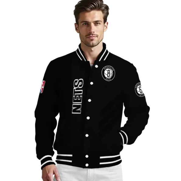 Here’s a closer look at what makes our Brooklyn Nets Triple Side Stripes Black Varsity Jacket stand out: