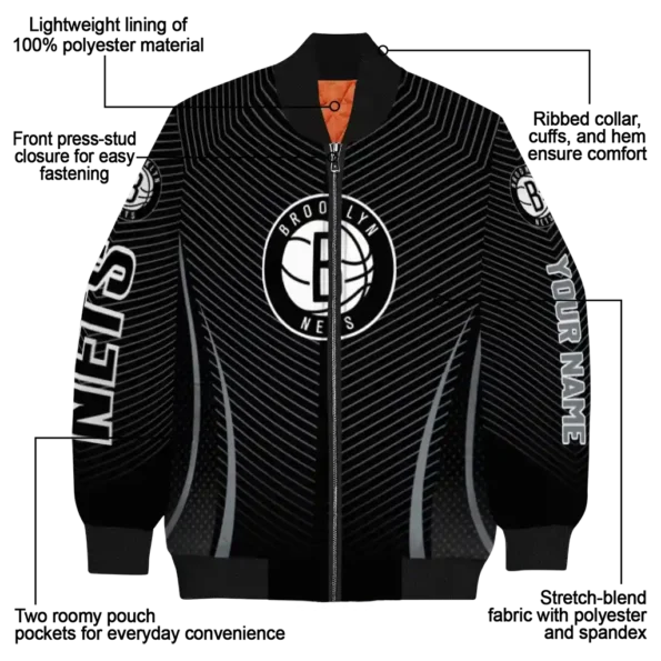 Uncover the details that make this Custom Brooklyn Nets Chevron Arrow Black Bomber Jacket a truly exceptional piece.
