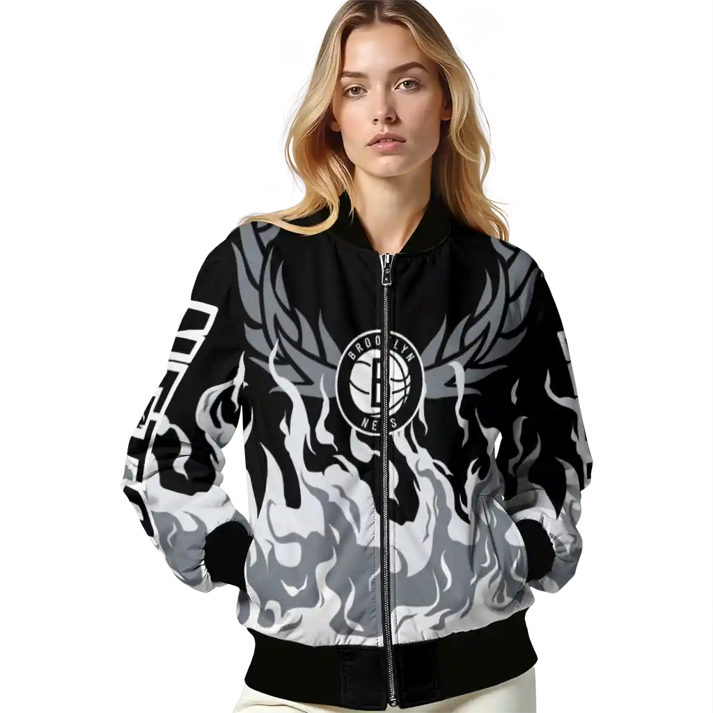 Personalized Brooklyn Nets Winged Blaze Black White Bomber Jacket