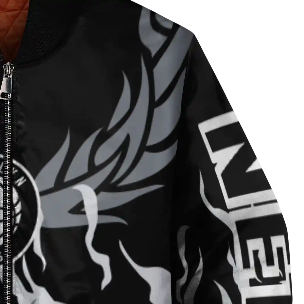 Uncover the details that make this Personalized Brooklyn Nets Winged Blaze Black White Bomber Jacket a truly exceptional piece.