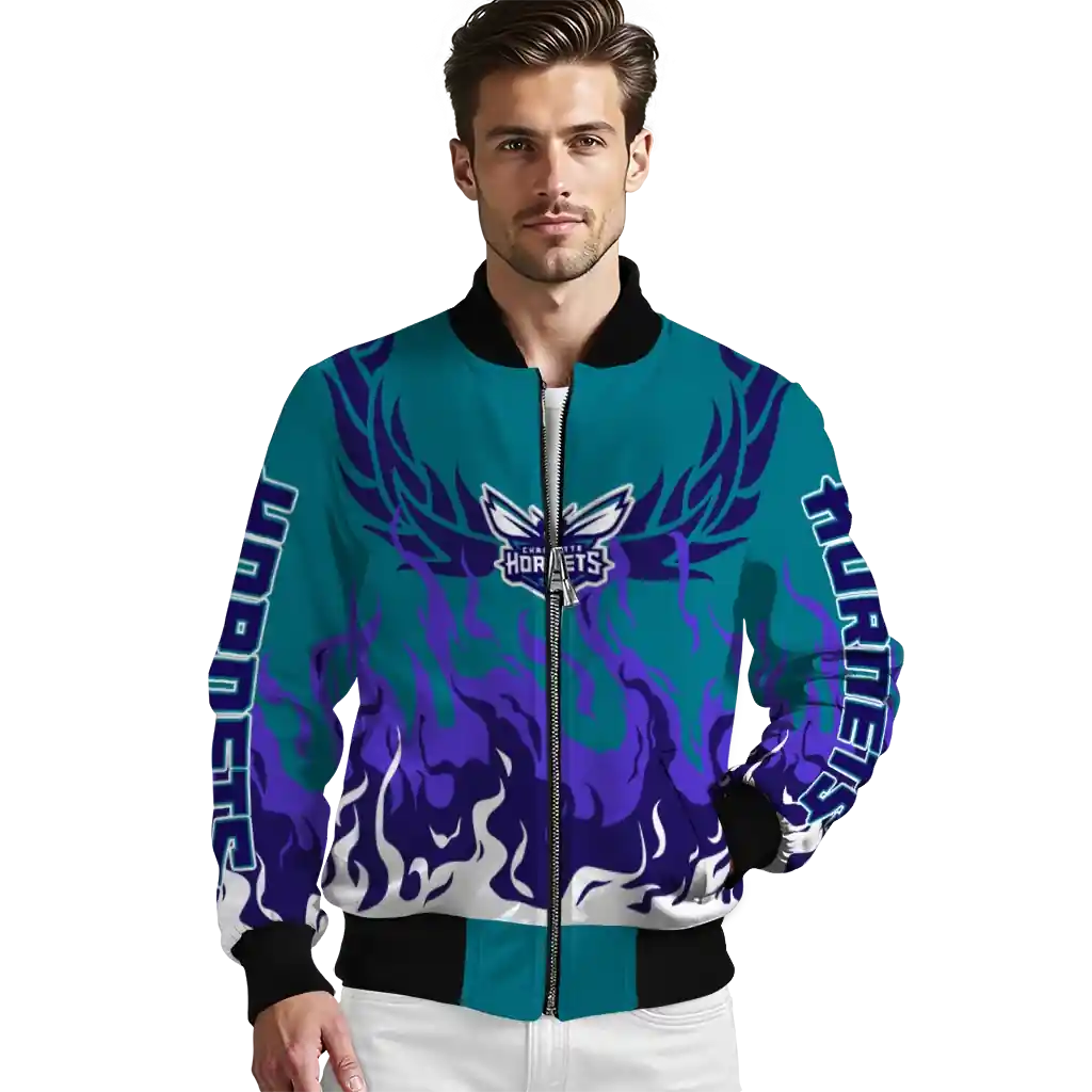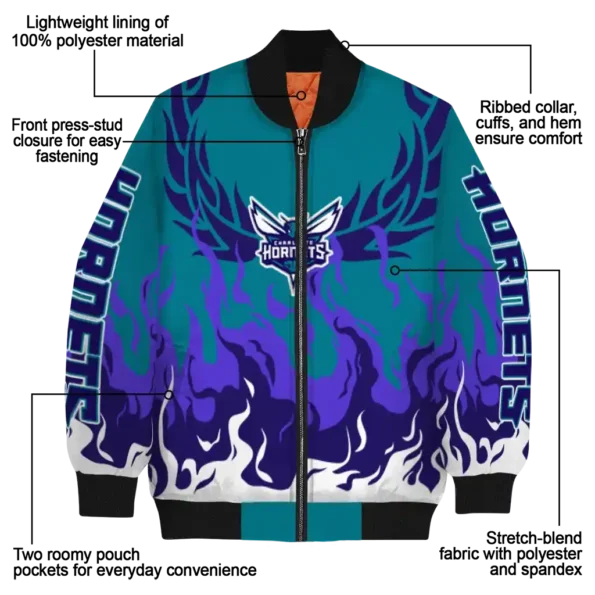 Uncover the details that make this Custom Charlotte Hornets Winged Blaze Teal White Bomber Jacket a truly exceptional piece.