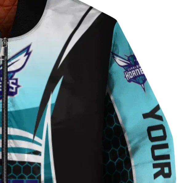 Uncover the details that make this Customized Charlotte Hornets Mesh Effect Teal Black Bomber Jacket a truly exceptional piece.