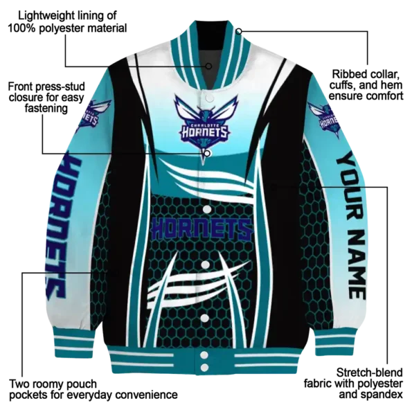Here’s a closer look at what makes our Customized Charlotte Hornets Mesh Effect Teal Black Varsity Jacket stand out: