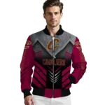 Uncover the details that make this Cleveland Cavaliers Arrow Layer Wine Black Bomber Jacket a truly exceptional piece.
