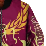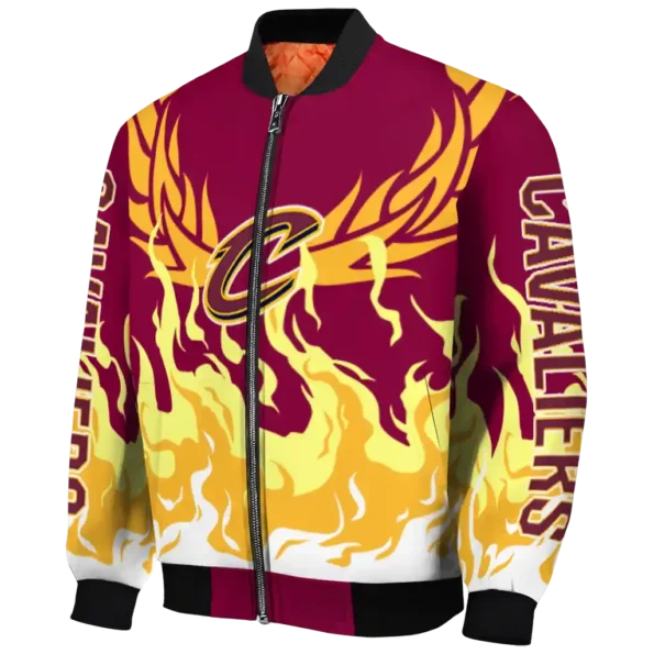 Uncover the details that make this Personalized Cleveland Cavaliers Winged Blaze Wine White Bomber Jacket a truly exceptional piece.