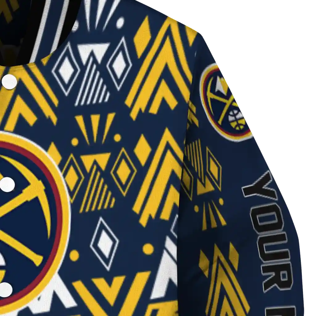 Here’s a closer look at what makes our Custom Denver Nuggets Pyramid Shapes Blue Varsity Jacket stand out: