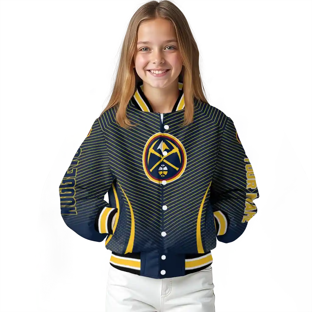 Here’s a closer look at what makes our Personalized Denver Nuggets Chevron Arrow Blue Varsity Jacket stand out: