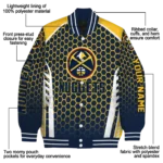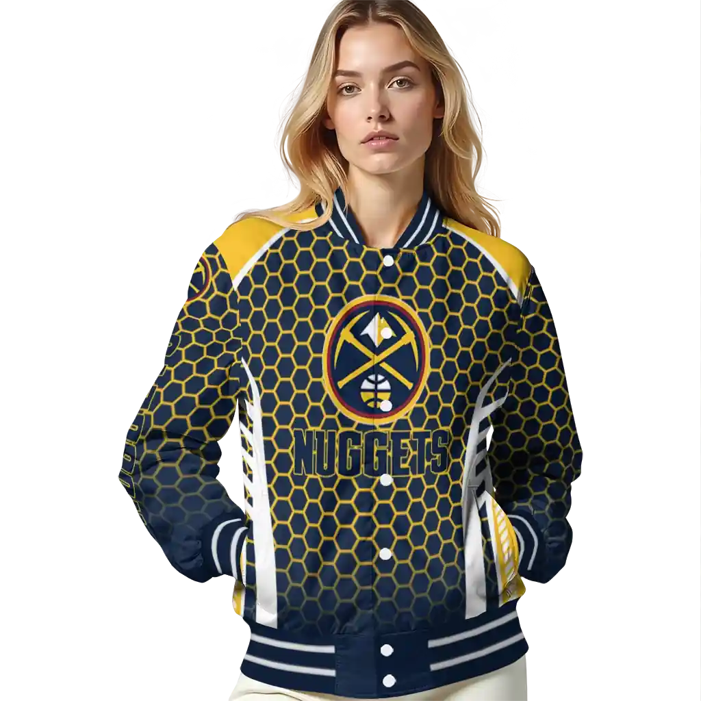 Here’s a closer look at what makes our Personalized Denver Nuggets Hexagon Grid Blue Varsity Jacket stand out: