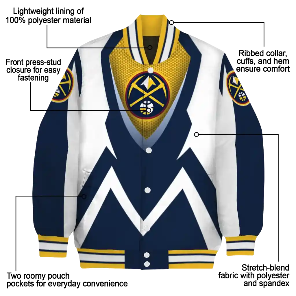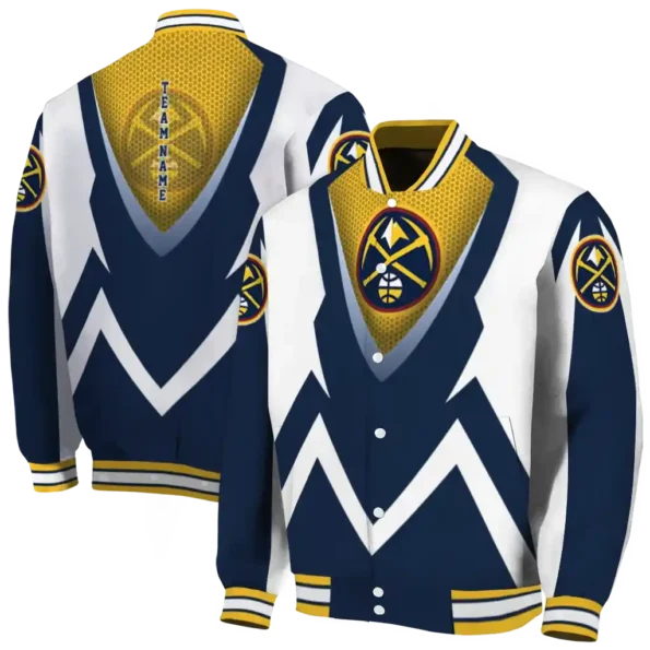 Here’s a closer look at what makes our Personalized Denver Nuggets V Stripes Blue White Varsity Jacket stand out: