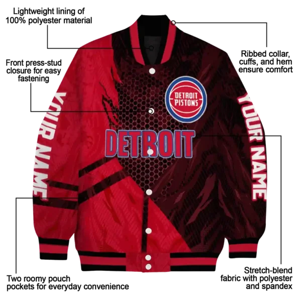 Here’s a closer look at what makes our Customized Detroit Pistons Hexagon Mesh Red Black Varsity Jacket stand out: