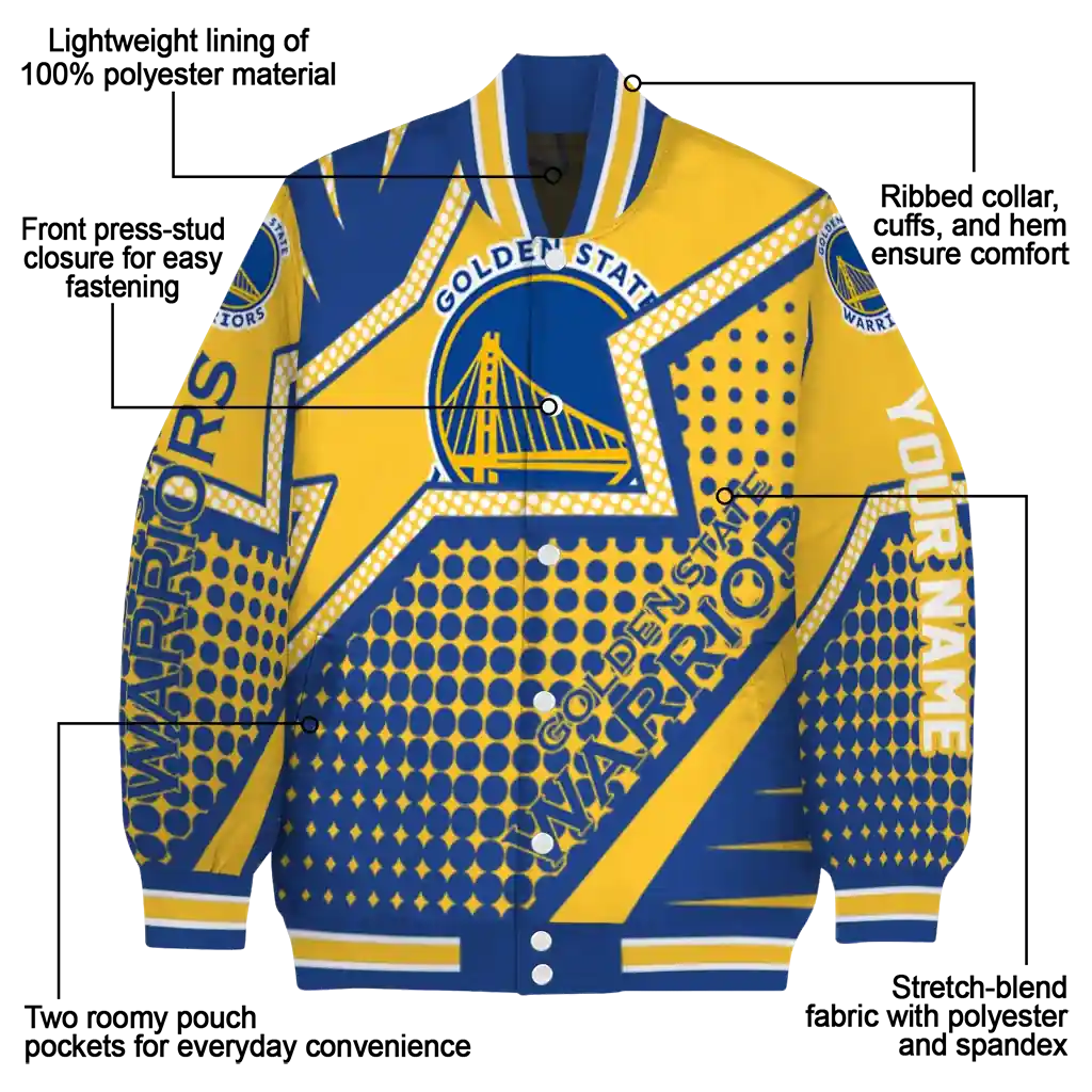 For the discerning NBA fan who values elevated style, this Custom Golden State Warriors Star Burst Blue Bomber Jacket from Golden State Warriors Jackets’s NBA Fan Pro boasts premium construction for lasting comfort and a proud display of team spirit. Its distinctive design and superior quality offer exceptional value, allowing you to wear your fandom with the same pride as your favorite jersey.
