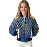 Uncover the details that make this Customized Golden State Warriors Hexagon Grid Blue Bomber Jacket a truly exceptional piece.