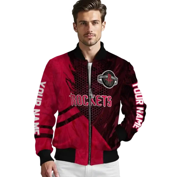 Uncover the details that make this Custom Houston Rockets Hexagon Mesh Red Black Bomber Jacket a truly exceptional piece.