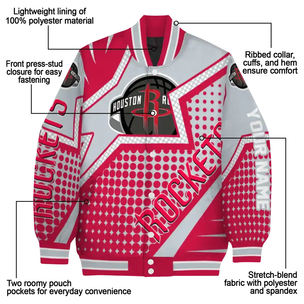For the discerning NBA fan who values elevated style, this Customized Houston Rockets Star Burst Red Bomber Jacket from Houston Rockets Jackets’s NBA Fan Pro boasts premium construction for lasting comfort and a proud display of team spirit. Its distinctive design and superior quality offer exceptional value, allowing you to wear your fandom with the same pride as your favorite jersey.