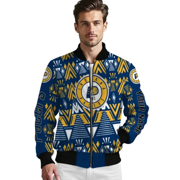 Uncover the details that make this Customized Indiana Pacers Pyramid Shapes Blue Bomber Jacket a truly exceptional piece.