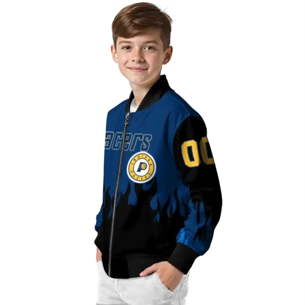 Uncover the details that make this Personalized Indiana Pacers Flame Border Blue Black Bomber Jacket a truly exceptional piece.