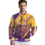 A true must-have for the sophisticated NBA enthusiast, this Personalized Los Angeles Lakers Hexagon Grid Purple Varsity Jacket from Los Angeles Lakers Jackets offers quality construction for durable, all-day comfort – ideal for showcasing your team pride. Its unique design and superior build provide exceptional value, making it the perfect way to embody your team identity like an iconic jersey.
