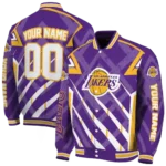 A true must-have for the sophisticated NBA enthusiast, this Personalized Los Angeles Lakers Chevron Angles Purple Varsity Jacket from Los Angeles Lakers Jackets offers quality construction for durable, all-day comfort – ideal for showcasing your team pride. Its unique design and superior build provide exceptional value, making it the perfect way to embody your team identity like an iconic jersey.