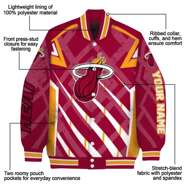 For the discerning NBA fan who values elevated style, this Personalized Miami Heat Power Plate Red Bomber Jacket from Miami Heat Jackets’s NBA Fan Pro boasts premium construction for lasting comfort and a proud display of team spirit. Its distinctive design and superior quality offer exceptional value, allowing you to wear your fandom with the same pride as your favorite jersey.