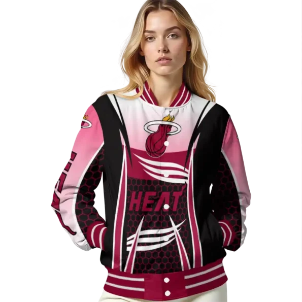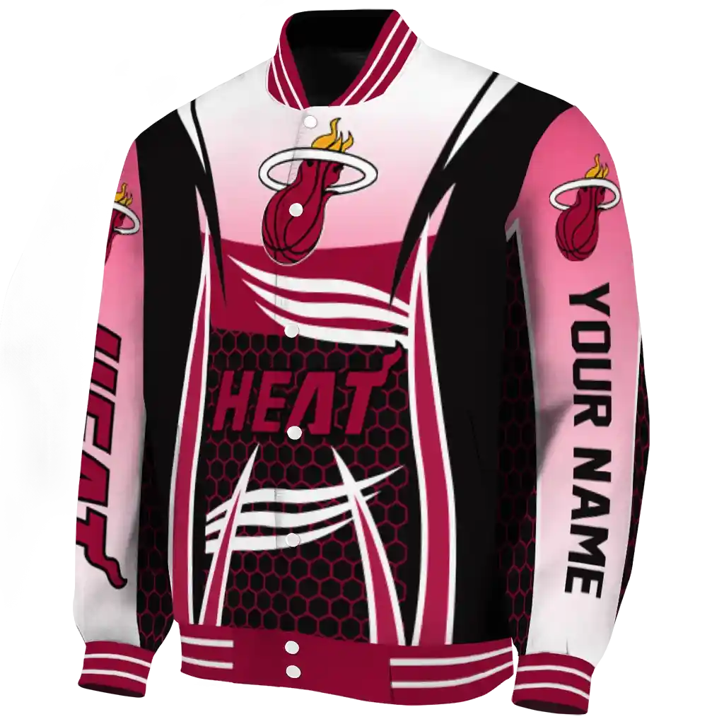 For the discerning NBA fan who values elevated style, this Personalized Miami Heat Hexagon Mesh Red Black Bomber Jacket from Miami Heat Jackets’s NBA Fan Pro boasts premium construction for lasting comfort and a proud display of team spirit. Its distinctive design and superior quality offer exceptional value, allowing you to wear your fandom with the same pride as your favorite jersey.
