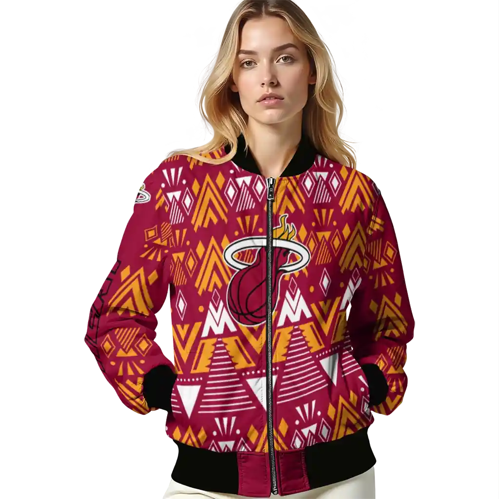 Uncover the details that make this Personalized Miami Heat Pyramid Shapes Red Bomber Jacket a truly exceptional piece.