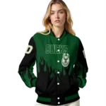Here’s a closer look at what makes our Custom Milwaukee Bucks Flame Border Green Black Varsity Jacket stand out: