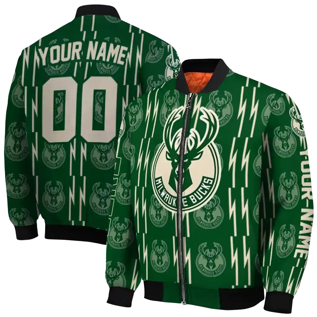 Uncover the details that make this Customized Milwaukee Bucks Bolt Stripe Green Bomber Jacket a truly exceptional piece.