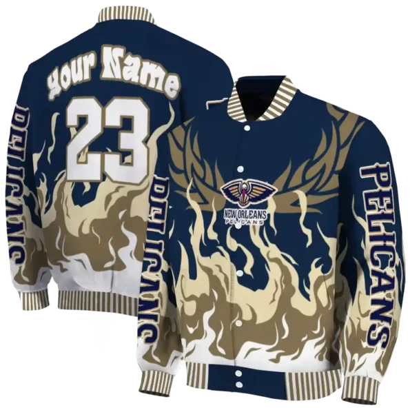 Here’s a closer look at what makes our Custom New Orleans Pelicans Winged Blaze Navy White Varsity Jacket stand out: