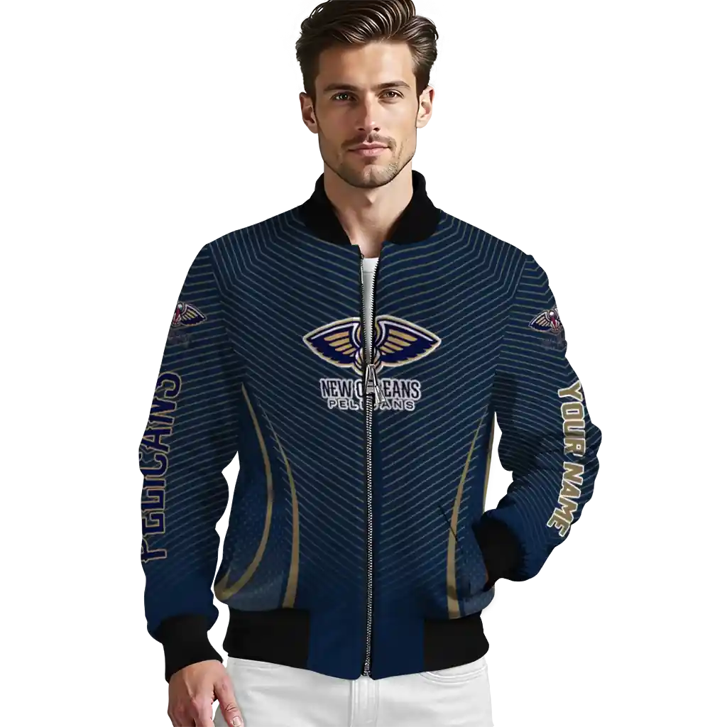 Uncover the details that make this Customized New Orleans Pelicans Chevron Arrow Navy Bomber Jacket a truly exceptional piece.