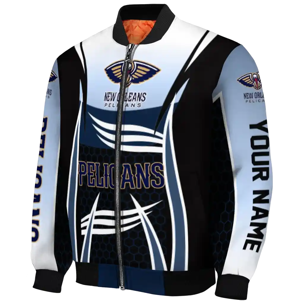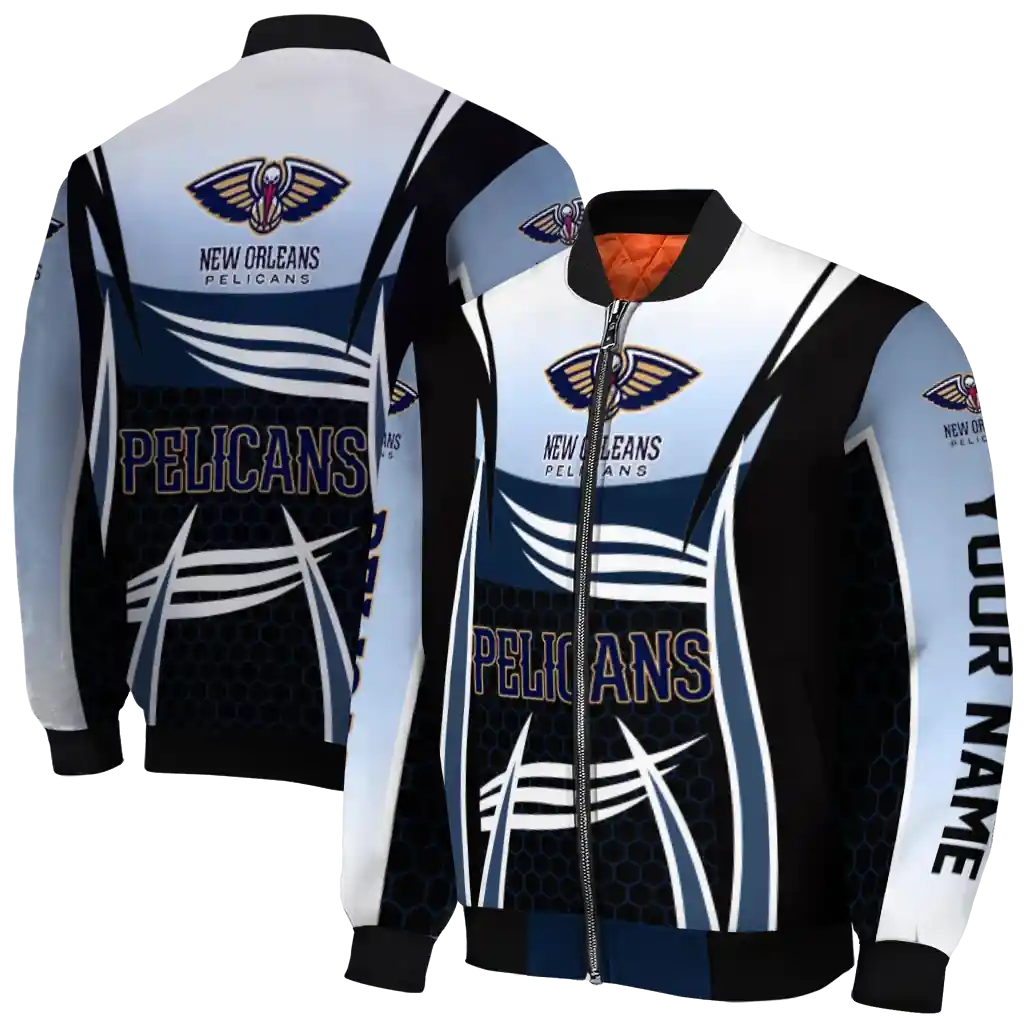 Uncover the details that make this Customized New Orleans Pelicans Mesh Effect Navy Black Bomber Jacket a truly exceptional piece.