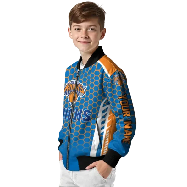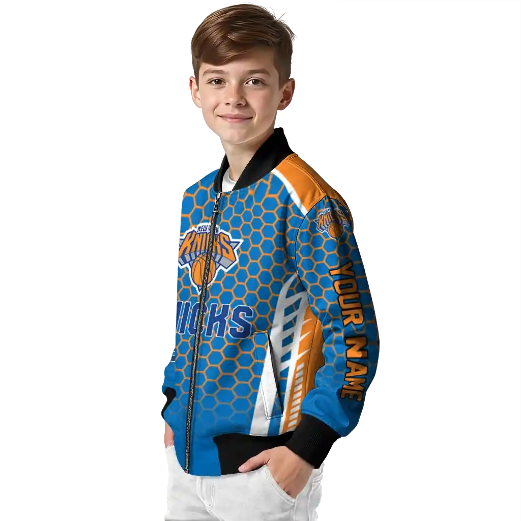 Personalized New York Knicks Hexagon Grid Blue Bomber Jacket