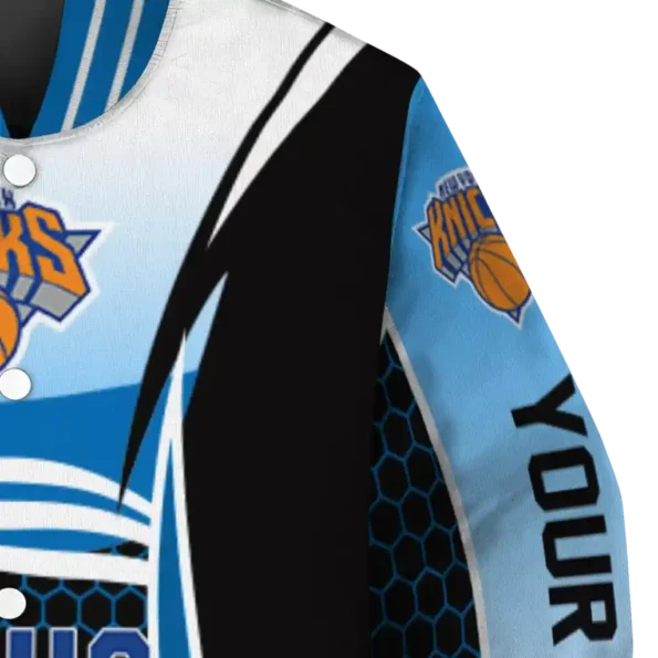 Here’s a closer look at what makes our Personalized New York Knicks Mesh Effect Blue Black Varsity Jacket stand out: