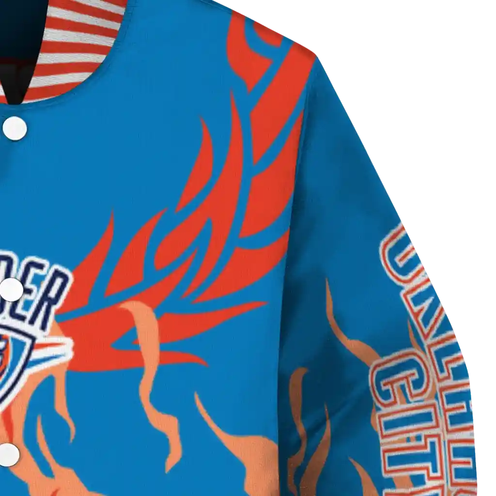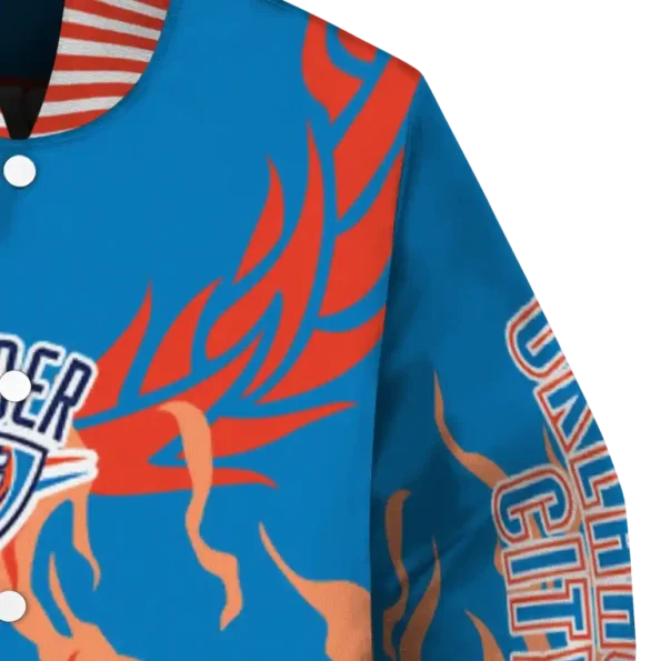 A true must-have for the sophisticated NBA enthusiast, this Personalized Oklahoma City Thunder Flame Border Blue Black Varsity Jacket from Oklahoma City Thunder Jackets offers quality construction for durable, all-day comfort – ideal for showcasing your team pride. Its unique design and superior build provide exceptional value, making it the perfect way to embody your team identity like an iconic jersey.