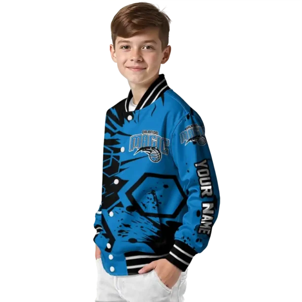 Here’s a closer look at what makes our Personalized Orlando Magic Hexagon Cluster Blue Black Varsity Jacket stand out: