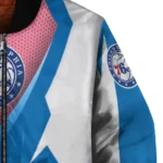 Uncover the details that make this Personalized Philadelphia 76ers V Stripes Blue White Bomber Jacket a truly exceptional piece.