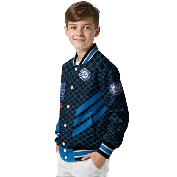 A true must-have for the sophisticated NBA enthusiast, this Personalized Philadelphia 76ers Mesh Effect Blue Black Varsity Jacket from Philadelphia 76ers Jackets offers quality construction for durable, all-day comfort – ideal for showcasing your team pride. Its unique design and superior build provide exceptional value, making it the perfect way to embody your team identity like an iconic jersey.