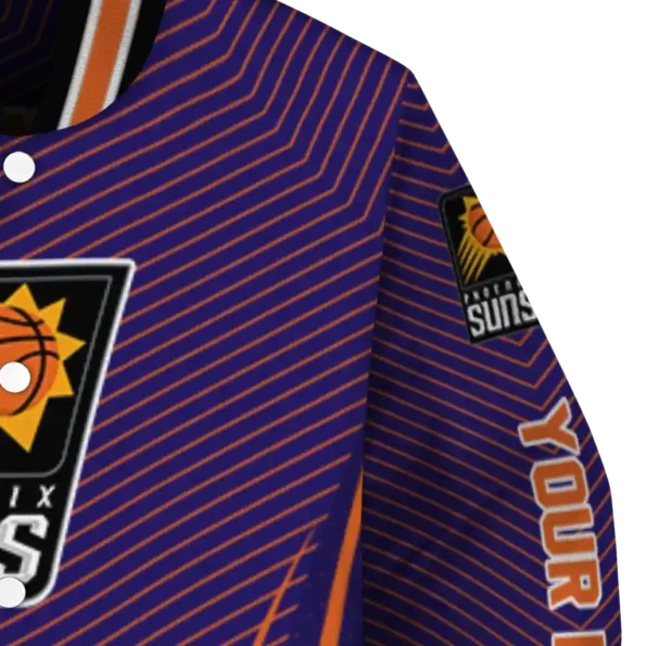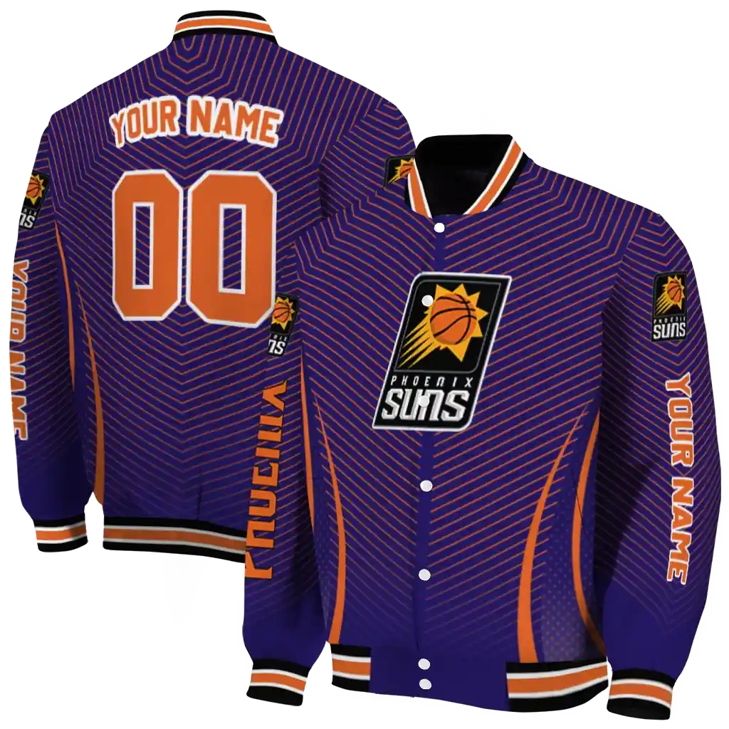 For the discerning NBA fan who values elevated style, this Personalized Phoenix Suns Bolt Stripe Purple Bomber Jacket from Phoenix Suns Jackets’s NBA Fan Pro boasts premium construction for lasting comfort and a proud display of team spirit. Its distinctive design and superior quality offer exceptional value, allowing you to wear your fandom with the same pride as your favorite jersey.
