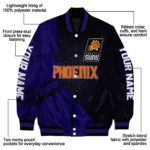 For the discerning NBA fan who values elevated style, this Customized Phoenix Suns Power Plate Purple Bomber Jacket from Phoenix Suns Jackets’s NBA Fan Pro boasts premium construction for lasting comfort and a proud display of team spirit. Its distinctive design and superior quality offer exceptional value, allowing you to wear your fandom with the same pride as your favorite jersey.
