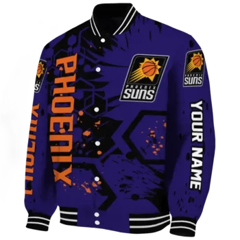 A true must-have for the sophisticated NBA enthusiast, this Customized Phoenix Suns Hexagon Cluster Purple Black Varsity Jacket from Phoenix Suns Jackets offers quality construction for durable, all-day comfort – ideal for showcasing your team pride. Its unique design and superior build provide exceptional value, making it the perfect way to embody your team identity like an iconic jersey.