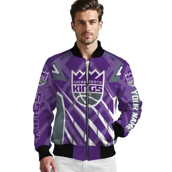 Uncover the details that make this Personalized Sacramento Kings Chevron Angles Purple Bomber Jacket a truly exceptional piece.