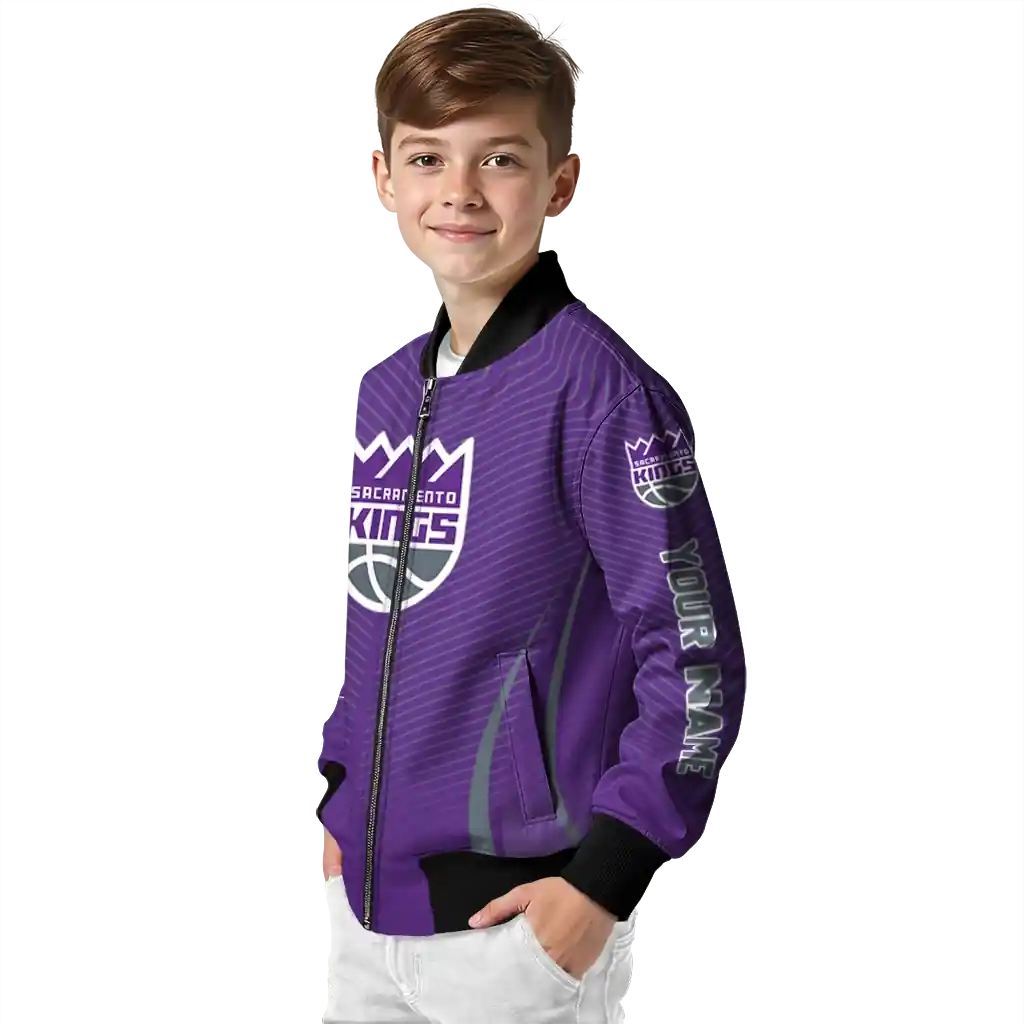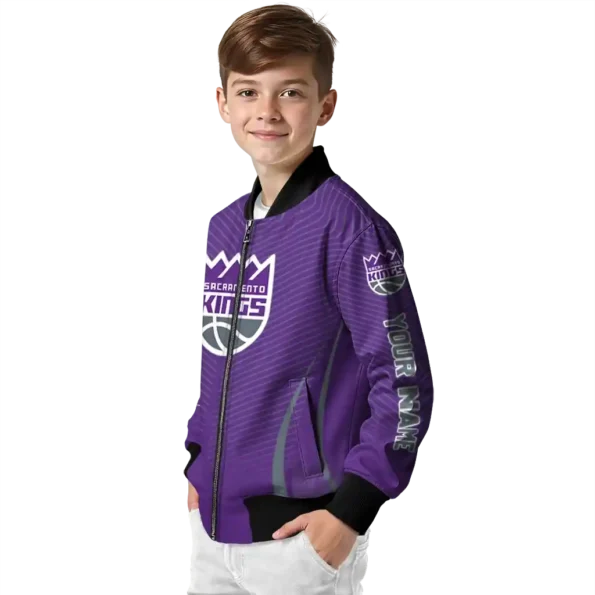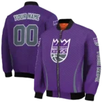 Uncover the details that make this Personalized Sacramento Kings Chevron Arrow Purple Bomber Jacket a truly exceptional piece.