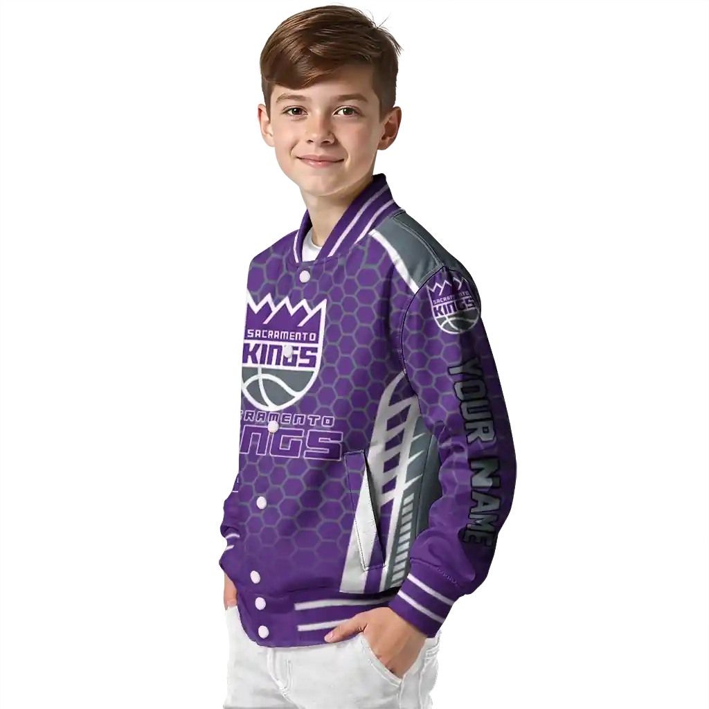 Personalized Sacramento Kings Hexagon Grid Purple Varsity Jacket