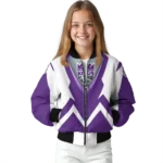 Uncover the details that make this Personalized Sacramento Kings V Stripes Purple White Bomber Jacket a truly exceptional piece.