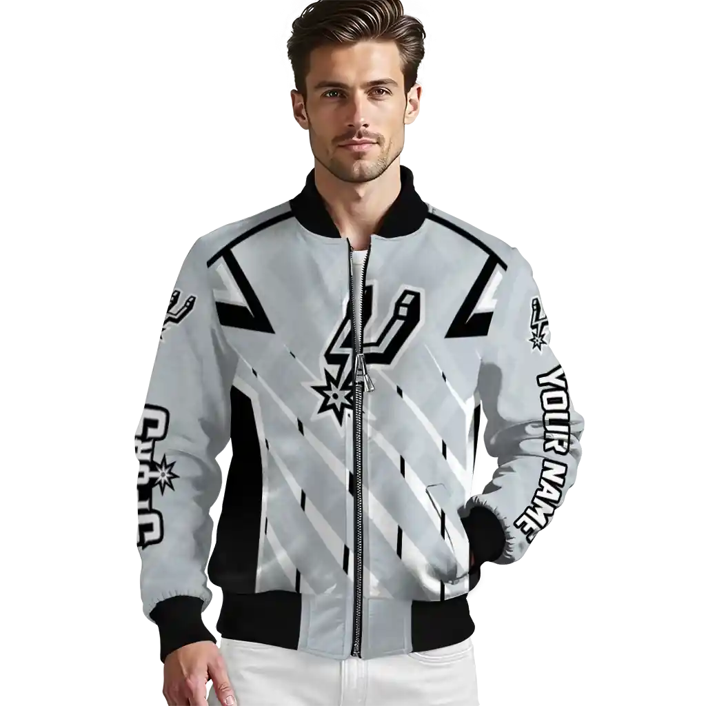 Uncover the details that make this Custom San Antonio Spurs Chevron Angles Silver Bomber Jacket a truly exceptional piece.