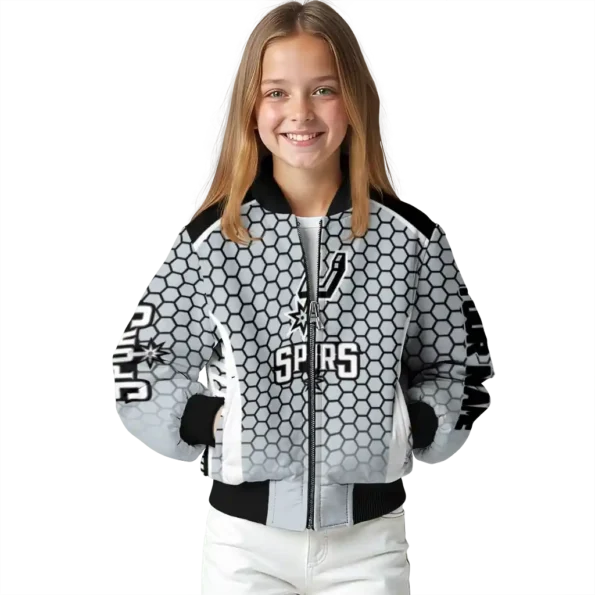 Uncover the details that make this Custom San Antonio Spurs Hexagon Grid Silver Bomber Jacket a truly exceptional piece.