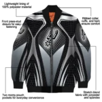 For the discerning NBA fan who values elevated style, this Personalized San Antonio Spurs Flame Border Silver Black Bomber Jacket from San Antonio Spurs Jackets’s NBA Fan Pro boasts premium construction for lasting comfort and a proud display of team spirit. Its distinctive design and superior quality offer exceptional value, allowing you to wear your fandom with the same pride as your favorite jersey.