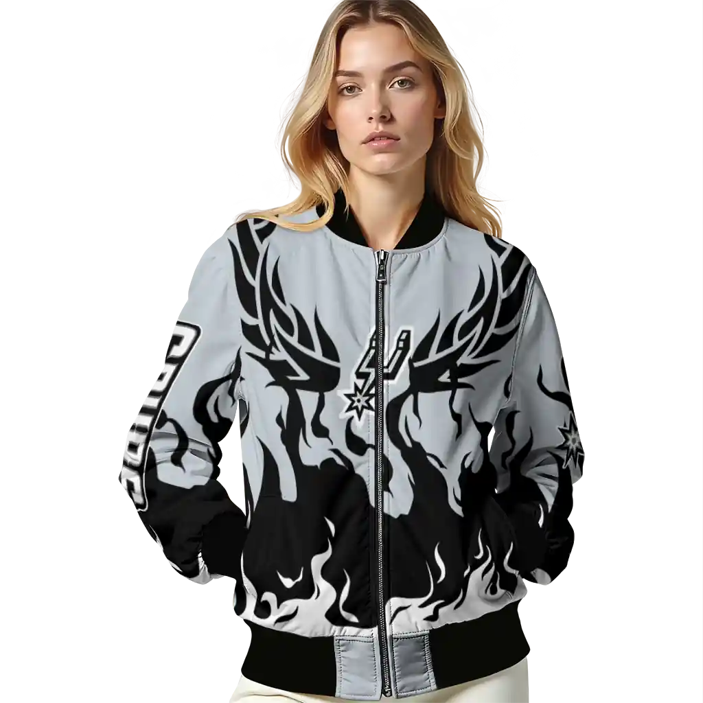 Uncover the details that make this Personalized San Antonio Spurs Winged Blaze Silver White Bomber Jacket a truly exceptional piece.