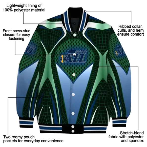 For the discerning NBA fan who values elevated style, this Utah Jazz Arrow Layer Navy Black Bomber Jacket from Utah Jazz Jackets’s NBA Fan Pro boasts premium construction for lasting comfort and a proud display of team spirit. Its distinctive design and superior quality offer exceptional value, allowing you to wear your fandom with the same pride as your favorite jersey.