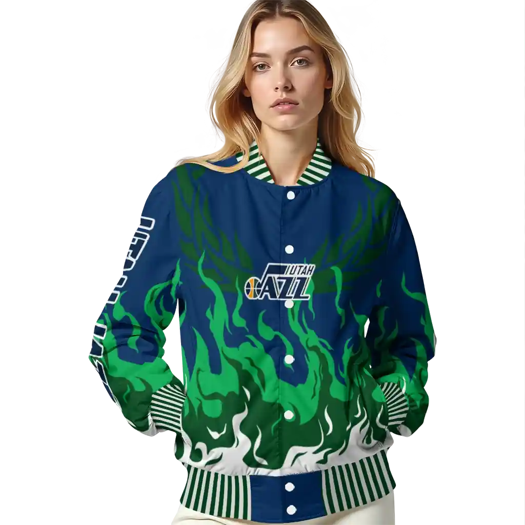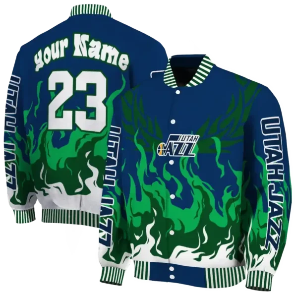 For the discerning NBA fan who values elevated style, this Custom Utah Jazz Flame Border Navy Black Bomber Jacket from Utah Jazz Jackets’s NBA Fan Pro boasts premium construction for lasting comfort and a proud display of team spirit. Its distinctive design and superior quality offer exceptional value, allowing you to wear your fandom with the same pride as your favorite jersey.