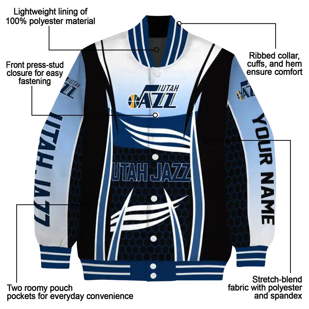 Here’s a closer look at what makes our Personalized Utah Jazz Mesh Effect Navy Black Varsity Jacket stand out: